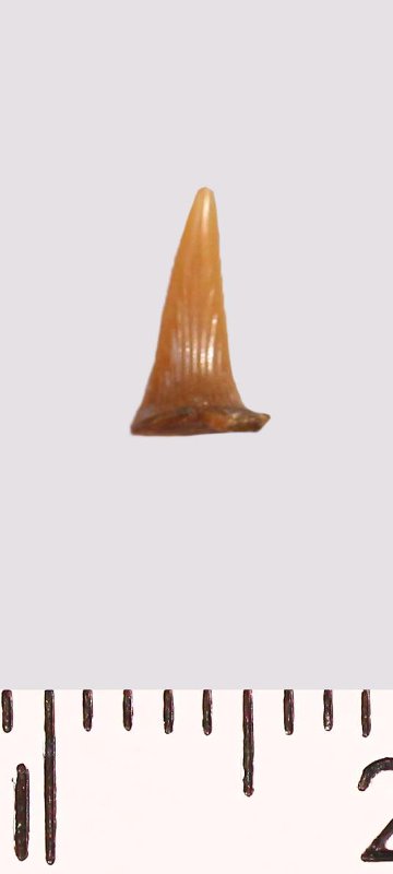 Зуб (фрагмент). Акула. Scapanorhynchus raphiodon (Agassiz, 1843). Классификация: Хордовые Chordata, Позвоночные Vertebrata, Хрящевые рыбы Chondrichthyes, Пластиножаберные Elasmobranchii