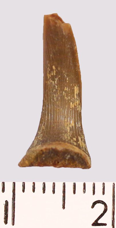 Зуб (фрагмент). Акула. Scapanorhynchus raphiodon (Agassiz, 1843). Классификация: Хордовые Chordata, Позвоночные Vertebrata, Хрящевые рыбы Chondrichthyes, Пластиножаберные Elasmobranchii