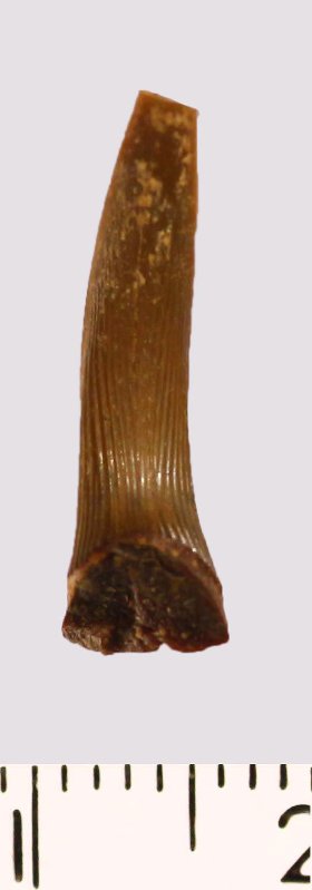 Зуб (фрагмент). Акула. Scapanorhynchus raphiodon (Agassiz, 1843). Классификация: Хордовые Chordata, Позвоночные Vertebrata, Хрящевые рыбы Chondrichthyes, Пластиножаберные Elasmobranchii