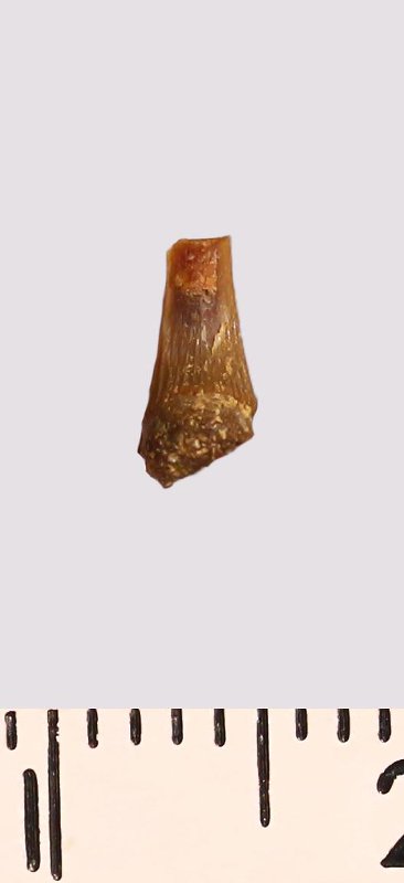 Зуб (фрагмент). Акула. Scapanorhynchus raphiodon (Agassiz, 1843). Классификация: Хордовые Chordata, Позвоночные Vertebrata, Хрящевые рыбы Chondrichthyes, Пластиножаберные Elasmobranchii