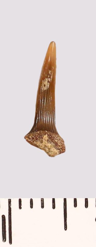 Зуб (фрагмент). Акула. Scapanorhynchus raphiodon (Agassiz, 1843). Классификация: Хордовые Chordata, Позвоночные Vertebrata, Хрящевые рыбы Chondrichthyes, Пластиножаберные Elasmobranchii