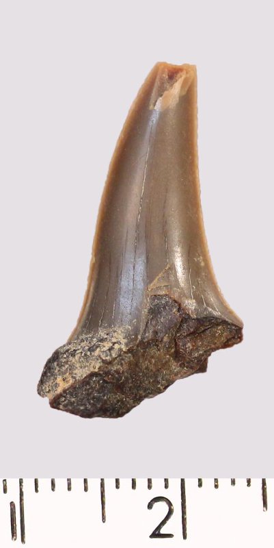 Зуб (фрагмент). Акула. Scapanorhynchus gigas Woodward, 1889. Классификация: Хордовые Chordata, Позвоночные Vertebrata, Хрящевые рыбы Chondrichthyes, Пластиножаберные Elasmobranchii