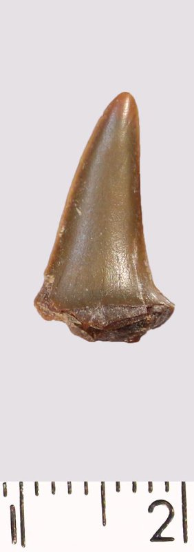 Зуб (фрагмент). Акула. Scapanorhynchus gigas Woodward, 1889. Классификация: Хордовые Chordata, Позвоночные Vertebrata, Хрящевые рыбы Chondrichthyes, Пластиножаберные Elasmobranchii