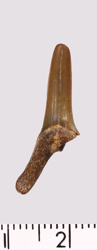 Зуб. Акула. Scapanorhynchus gigas Woodward, 1889. Классификация: Хордовые Chordata, Позвоночные Vertebrata, Хрящевые рыбы Chondrichthyes, Пластиножаберные Elasmobranchii
