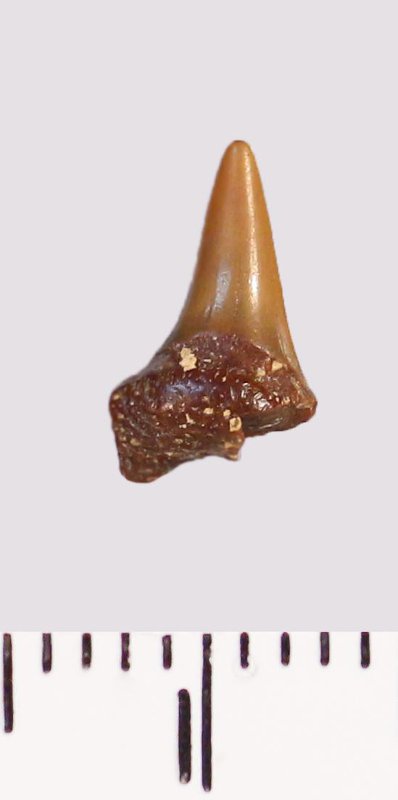 Зуб (фрагмент). Акула. Odontaspis ex gr. macrorhiza (Cope) Leriche, 1902. Классификация: Хордовые Chordata, Позвоночные Vertebrata, Хрящевые рыбы Chondrichthyes, Пластиножаберные Elasmobranchii