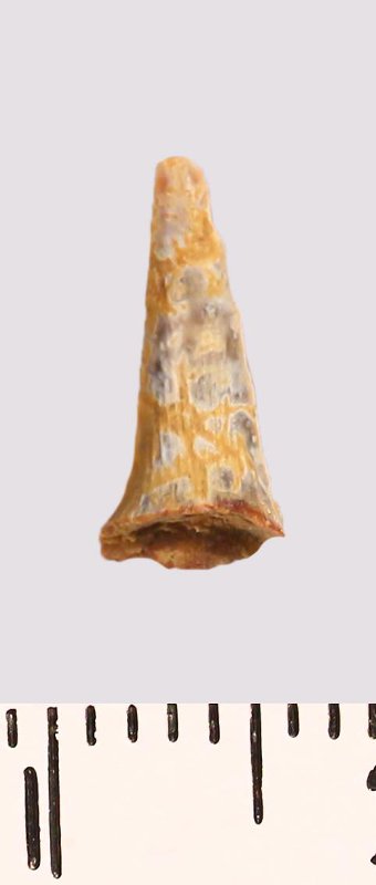 Зуб (фрагмент). Акула. Scapanorhynchus raphiodon (Agassiz, 1843). Классификация: Хордовые Chordata, Позвоночные Vertebrata, Хрящевые рыбы Chondrichthyes, Пластиножаберные Elasmobranchii