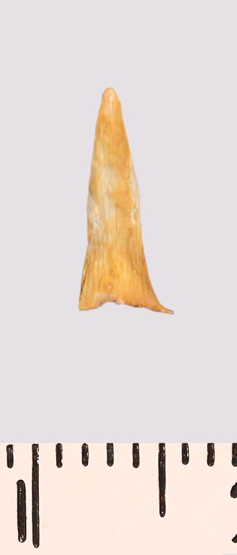 Зуб (фрагмент). Акула. Scapanorhynchus raphiodon (Agassiz, 1843). Классификация: Хордовые Chordata, Позвоночные Vertebrata, Хрящевые рыбы Chondrichthyes, Пластиножаберные Elasmobranchii