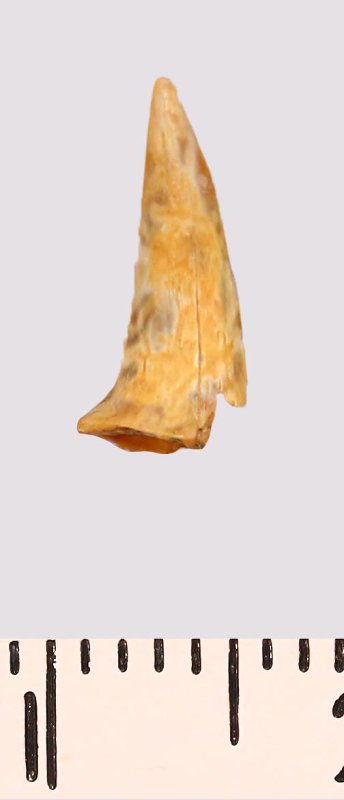 Зуб (фрагмент). Акула. Scapanorhynchus raphiodon (Agassiz, 1843). Классификация: Хордовые Chordata, Позвоночные Vertebrata, Хрящевые рыбы Chondrichthyes, Пластиножаберные Elasmobranchii