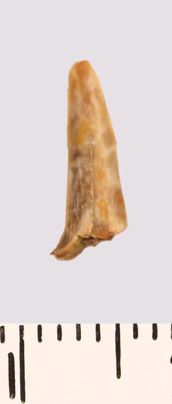 Зуб (фрагмент). Акула. Scapanorhynchus raphiodon (Agassiz, 1843). Классификация: Хордовые Chordata, Позвоночные Vertebrata, Хрящевые рыбы Chondrichthyes, Пластиножаберные Elasmobranchii