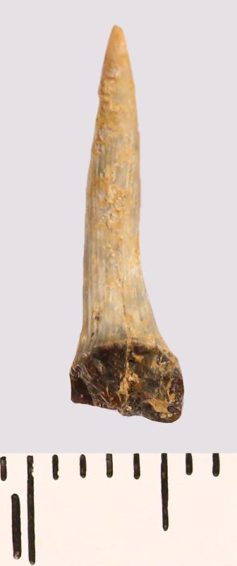 Зуб (фрагмент). Акула. Scapanorhynchus raphiodon (Agassiz, 1843). Классификация: Хордовые Chordata, Позвоночные Vertebrata, Хрящевые рыбы Chondrichthyes, Пластиножаберные Elasmobranchii