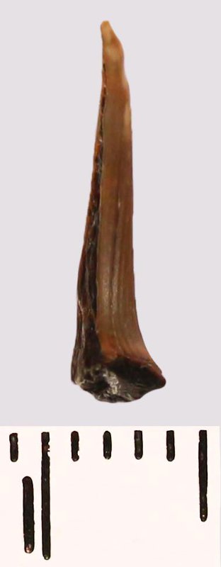 Зуб (фрагмент). Акула. Scapanorhynchus raphiodon (Agassiz, 1843). Классификация: Хордовые Chordata, Позвоночные Vertebrata, Хрящевые рыбы Chondrichthyes, Пластиножаберные Elasmobranchii