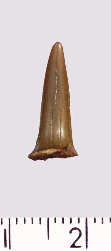 Зуб (фрагмент). Акула. Scapanorhynchus gigas Woodward, 1889. Классификация: Хордовые Chordata, Позвоночные Vertebrata, Хрящевые рыбы Chondrichthyes, Пластиножаберные Elasmobranchii