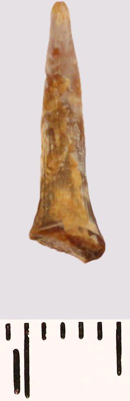 Зуб (фрагмент). Акула. Scapanorhynchus raphiodon (Agassiz, 1843). Классификация: Хордовые Chordata, Позвоночные Vertebrata, Хрящевые рыбы Chondrichthyes, Пластиножаберные Elasmobranchii