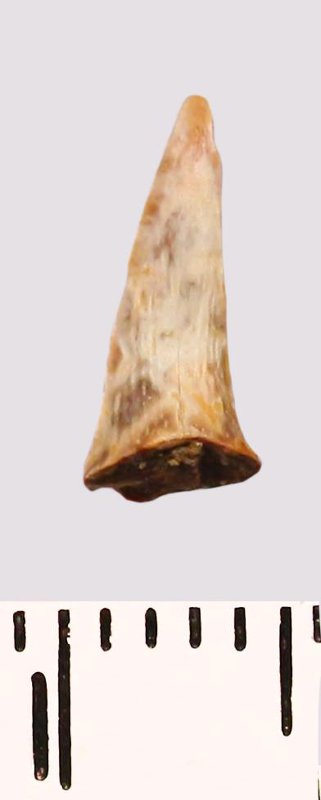 Зуб (фрагмент). Акула. Scapanorhynchus raphiodon (Agassiz, 1843). Классификация: Хордовые Chordata, Позвоночные Vertebrata, Хрящевые рыбы Chondrichthyes, Пластиножаберные Elasmobranchii