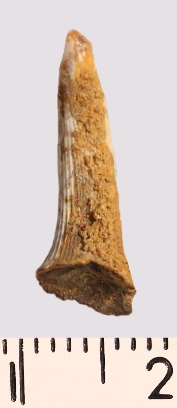 Зуб (фрагмент). Акула. Scapanorhynchus raphiodon (Agassiz, 1843). Классификация: Хордовые Chordata, Позвоночные Vertebrata, Хрящевые рыбы Chondrichthyes, Пластиножаберные Elasmobranchii