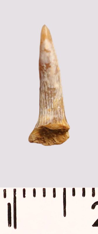 Зуб (фрагмент). Акула. Scapanorhynchus raphiodon (Agassiz, 1843). Классификация: Хордовые Chordata, Позвоночные Vertebrata, Хрящевые рыбы Chondrichthyes, Пластиножаберные Elasmobranchii
