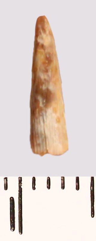 Зуб (фрагмент). Акула. Scapanorhynchus raphiodon (Agassiz, 1843). Классификация: Хордовые Chordata, Позвоночные Vertebrata, Хрящевые рыбы Chondrichthyes, Пластиножаберные Elasmobranchii