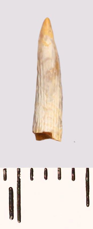 Зуб (фрагмент). Акула. Scapanorhynchus raphiodon (Agassiz, 1843). Классификация: Хордовые Chordata, Позвоночные Vertebrata, Хрящевые рыбы Chondrichthyes, Пластиножаберные Elasmobranchii