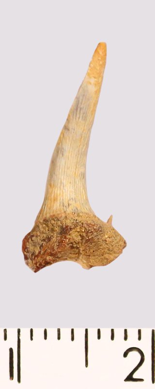 Зуб (фрагмент). Акула. Scapanorhynchus raphiodon (Agassiz, 1843). Классификация: Хордовые Chordata, Позвоночные Vertebrata, Хрящевые рыбы Chondrichthyes, Пластиножаберные Elasmobranchii