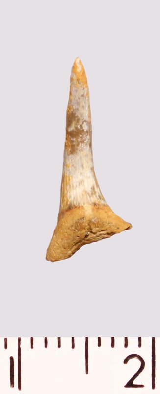 Зуб (фрагмент). Акула. Scapanorhynchus raphiodon (Agassiz, 1843). Классификация: Хордовые Chordata, Позвоночные Vertebrata, Хрящевые рыбы Chondrichthyes, Пластиножаберные Elasmobranchii