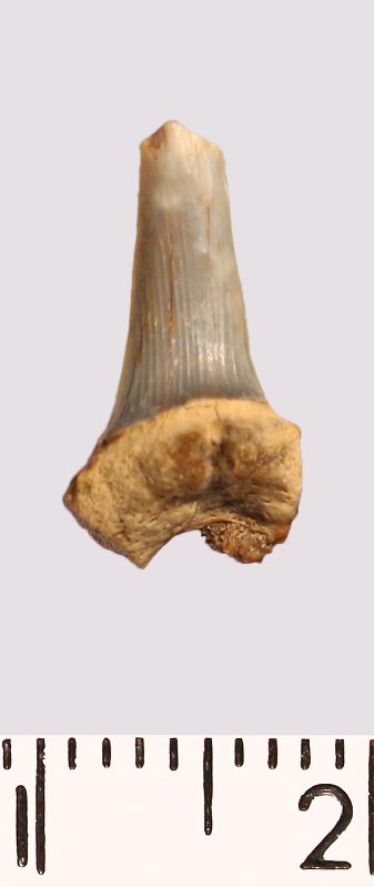 Зуб (фрагмент). Акула. Scapanorhynchus raphiodon (Agassiz, 1843). Классификация: Хордовые Chordata, Позвоночные Vertebrata, Хрящевые рыбы Chondrichthyes, Пластиножаберные Elasmobranchii