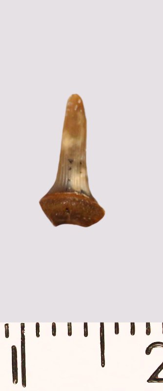 Зуб (фрагмент). Акула. Scapanorhynchus raphiodon (Agassiz, 1843). Классификация: Хордовые Chordata, Позвоночные Vertebrata, Хрящевые рыбы Chondrichthyes, Пластиножаберные Elasmobranchii