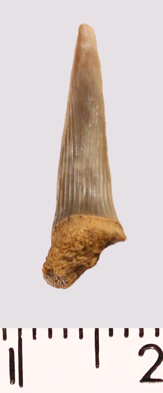 Зуб (фрагмент). Акула. Scapanorhynchus raphiodon (Agassiz, 1843). Классификация: Хордовые Chordata, Позвоночные Vertebrata, Хрящевые рыбы Chondrichthyes, Пластиножаберные Elasmobranchii
