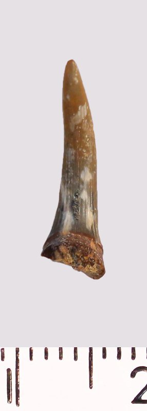 Зуб (фрагмент). Акула. Scapanorhynchus raphiodon (Agassiz, 1843). Классификация: Хордовые Chordata, Позвоночные Vertebrata, Хрящевые рыбы Chondrichthyes, Пластиножаберные Elasmobranchii