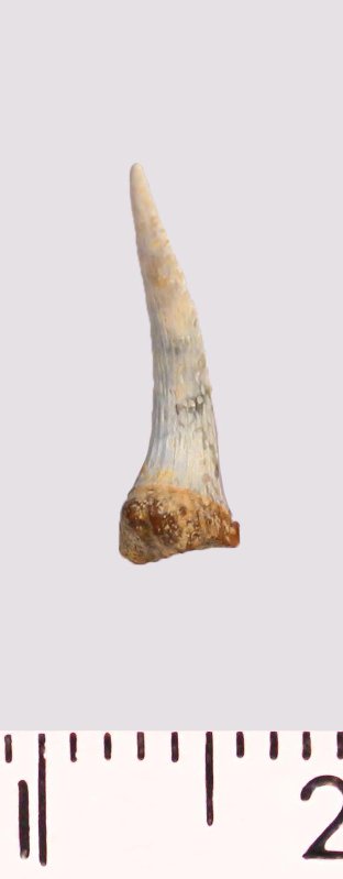 Зуб (фрагмент). Акула. Scapanorhynchus raphiodon (Agassiz, 1843). Классификация: Хордовые Chordata, Позвоночные Vertebrata, Хрящевые рыбы Chondrichthyes, Пластиножаберные Elasmobranchii