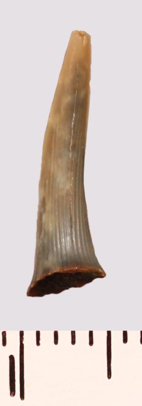 Зуб (фрагмент). Акула. Scapanorhynchus raphiodon (Agassiz, 1843). Классификация: Хордовые Chordata, Позвоночные Vertebrata, Хрящевые рыбы Chondrichthyes, Пластиножаберные Elasmobranchii