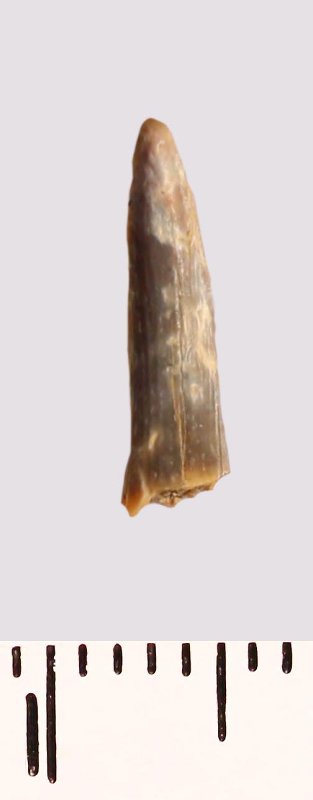 Зуб (фрагмент). Акула. Scapanorhynchus raphiodon (Agassiz, 1843). Классификация: Хордовые Chordata, Позвоночные Vertebrata, Хрящевые рыбы Chondrichthyes, Пластиножаберные Elasmobranchii