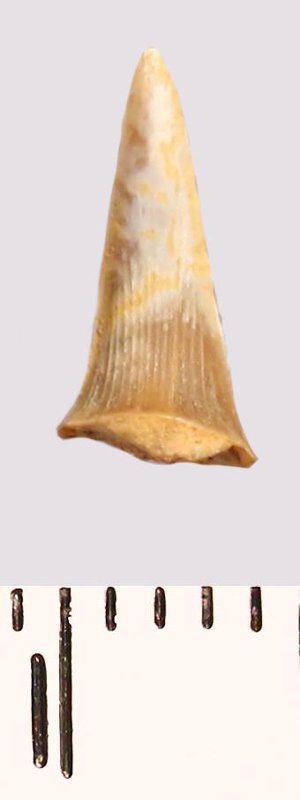 Зуб (фрагмент). Акула. Scapanorhynchus raphiodon (Agassiz, 1843). Классификация: Хордовые Chordata, Позвоночные Vertebrata, Хрящевые рыбы Chondrichthyes, Пластиножаберные Elasmobranchii