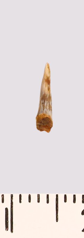 Зуб (фрагмент). Акула. Scapanorhynchus raphiodon (Agassiz, 1843). Классификация: Хордовые Chordata, Позвоночные Vertebrata, Хрящевые рыбы Chondrichthyes, Пластиножаберные Elasmobranchii