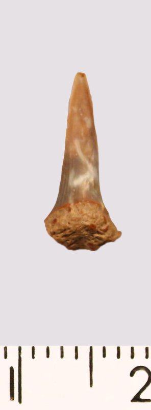 Зуб (фрагмент). Акула. Scapanorhynchus raphiodon (Agassiz, 1843). Классификация: Хордовые Chordata, Позвоночные Vertebrata, Хрящевые рыбы Chondrichthyes, Пластиножаберные Elasmobranchii