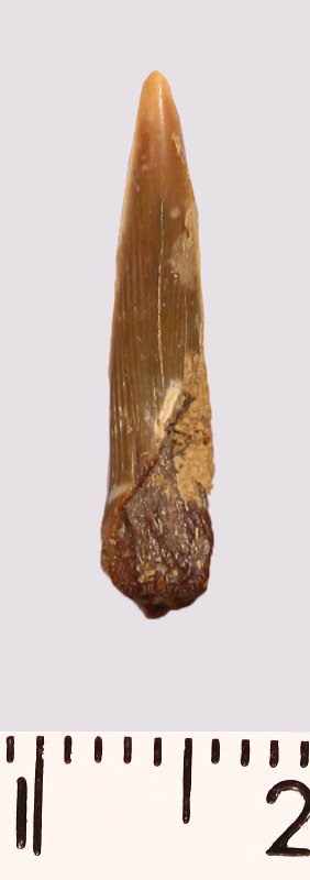 Зуб (фрагмент). Акула. Scapanorhynchus raphiodon (Agassiz, 1843). Классификация: Хордовые Chordata, Позвоночные Vertebrata, Хрящевые рыбы Chondrichthyes, Пластиножаберные Elasmobranchii