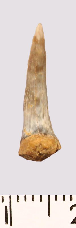 Зуб (фрагмент). Акула. Scapanorhynchus raphiodon (Agassiz, 1843). Классификация: Хордовые Chordata, Позвоночные Vertebrata, Хрящевые рыбы Chondrichthyes, Пластиножаберные Elasmobranchii