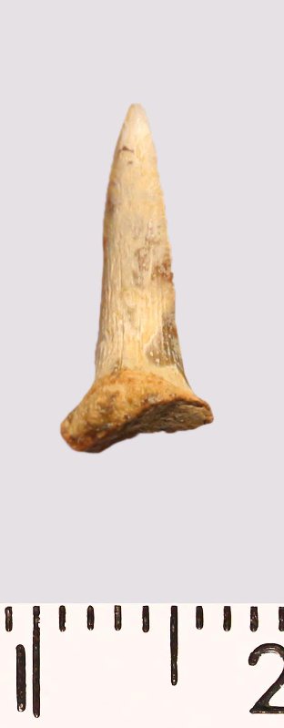 Зуб (фрагмент). Акула. Scapanorhynchus raphiodon (Agassiz, 1843). Классификация: Хордовые Chordata, Позвоночные Vertebrata, Хрящевые рыбы Chondrichthyes, Пластиножаберные Elasmobranchii