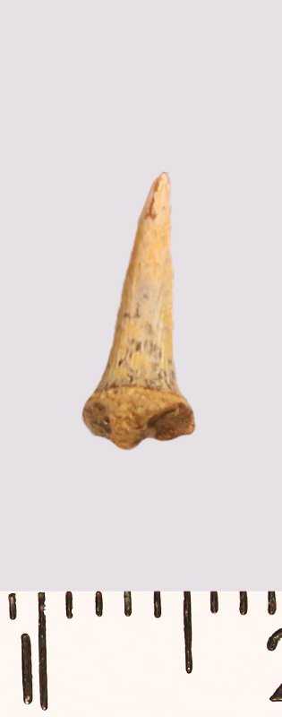Зуб (фрагмент). Акула. Scapanorhynchus raphiodon (Agassiz, 1843). Классификация: Хордовые Chordata, Позвоночные Vertebrata, Хрящевые рыбы Chondrichthyes, Пластиножаберные Elasmobranchii