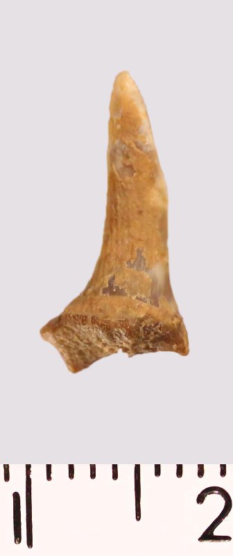 Зуб (фрагмент). Акула. Scapanorhynchus raphiodon (Agassiz, 1843). Классификация: Хордовые Chordata, Позвоночные Vertebrata, Хрящевые рыбы Chondrichthyes, Пластиножаберные Elasmobranchii