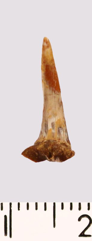 Зуб (фрагмент). Акула. Scapanorhynchus raphiodon (Agassiz, 1843). Классификация: Хордовые Chordata, Позвоночные Vertebrata, Хрящевые рыбы Chondrichthyes, Пластиножаберные Elasmobranchii