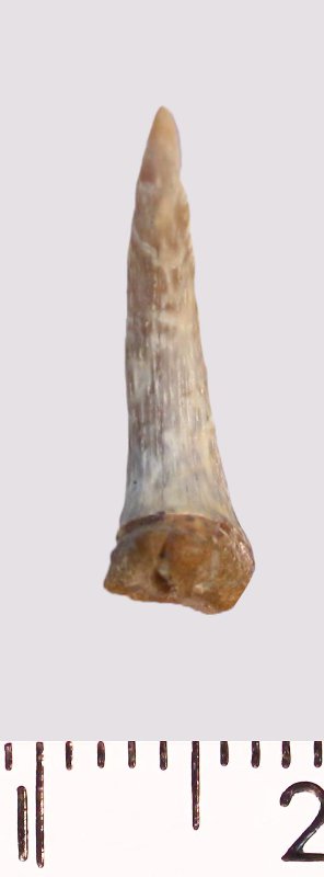 Зуб (фрагмент). Акула. Scapanorhynchus raphiodon (Agassiz, 1843). Классификация: Хордовые Chordata, Позвоночные Vertebrata, Хрящевые рыбы Chondrichthyes, Пластиножаберные Elasmobranchii