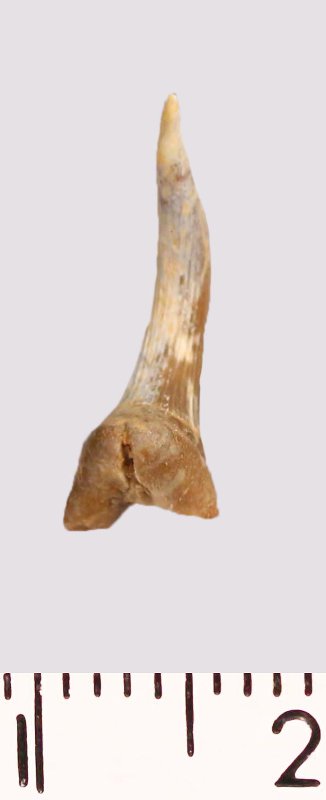Зуб (фрагмент). Акула. Scapanorhynchus raphiodon (Agassiz, 1843). Классификация: Хордовые Chordata, Позвоночные Vertebrata, Хрящевые рыбы Chondrichthyes, Пластиножаберные Elasmobranchii