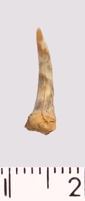 Зуб (фрагмент). Акула. Scapanorhynchus raphiodon (Agassiz, 1843). Классификация: Хордовые Chordata, Позвоночные Vertebrata, Хрящевые рыбы Chondrichthyes, Пластиножаберные Elasmobranchii