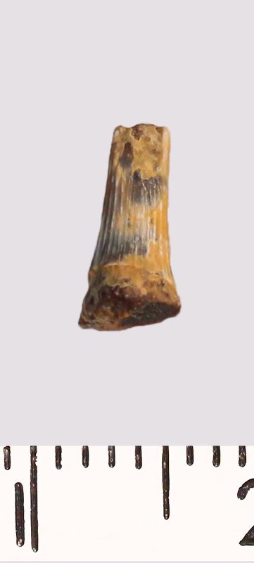 Зуб (фрагмент). Акула. Scapanorhynchus raphiodon (Agassiz, 1843). Классификация: Хордовые Chordata, Позвоночные Vertebrata, Хрящевые рыбы Chondrichthyes, Пластиножаберные Elasmobranchii