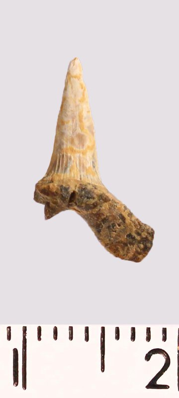 Зуб. Акула. Scapanorhynchus raphiodon (Agassiz, 1843). Классификация: Хордовые Chordata, Позвоночные Vertebrata, Хрящевые рыбы Chondrichthyes, Пластиножаберные Elasmobranchii