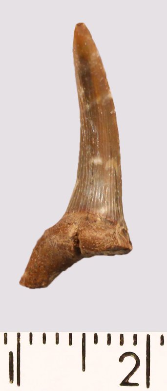 Зуб. Акула. Scapanorhynchus raphiodon (Agassiz, 1843). Классификация: Хордовые Chordata, Позвоночные Vertebrata, Хрящевые рыбы Chondrichthyes, Пластиножаберные Elasmobranchii