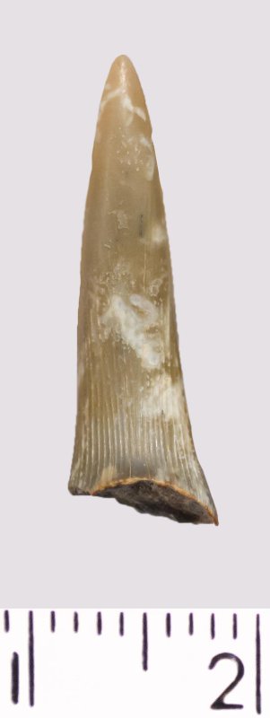 Зуб (фрагмент). Акула. Rhaphiodus sp. Классификация: Хордовые Chordata, Позвоночные Vertebrata, Хрящевые рыбы Chondrichthyes, Пластиножаберные Elasmobranchii