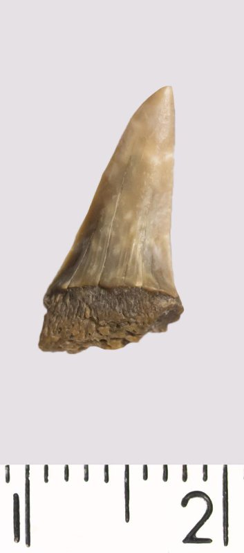 Зуб (фрагмент). Акула. Rhaphiodus sp. Классификация: Хордовые Chordata, Позвоночные Vertebrata, Хрящевые рыбы Chondrichthyes, Пластиножаберные Elasmobranchii
