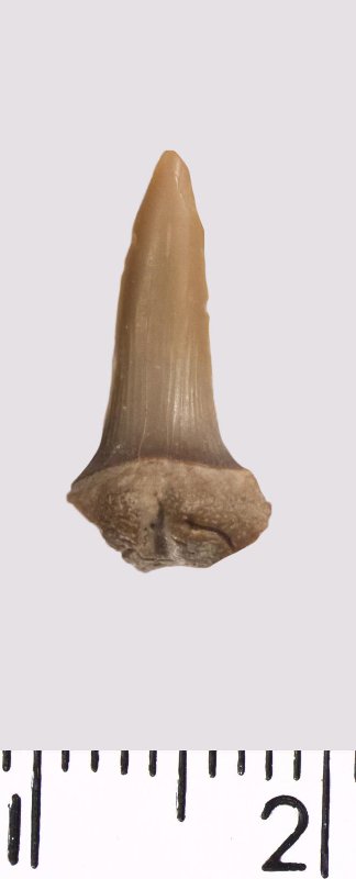 Зуб (фрагмент). Акула. Rhaphiodus sp. Классификация: Хордовые Chordata, Позвоночные Vertebrata, Хрящевые рыбы Chondrichthyes, Пластиножаберные Elasmobranchii