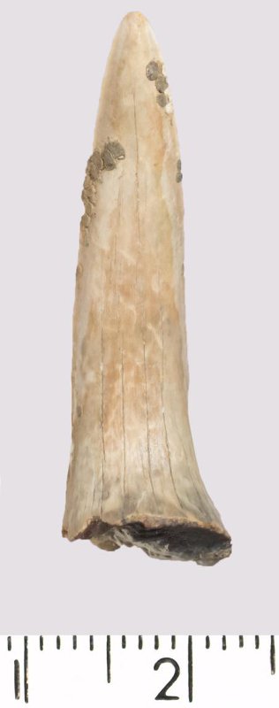 Зуб (фрагмент). Акула. Scapanorhynchus gigas Woodward 1889. Классификация: Хордовые Chordata, Позвоночные Vertebrata, Хрящевые рыбы Chondrichthyes, Пластиножаберные Elasmobranchii